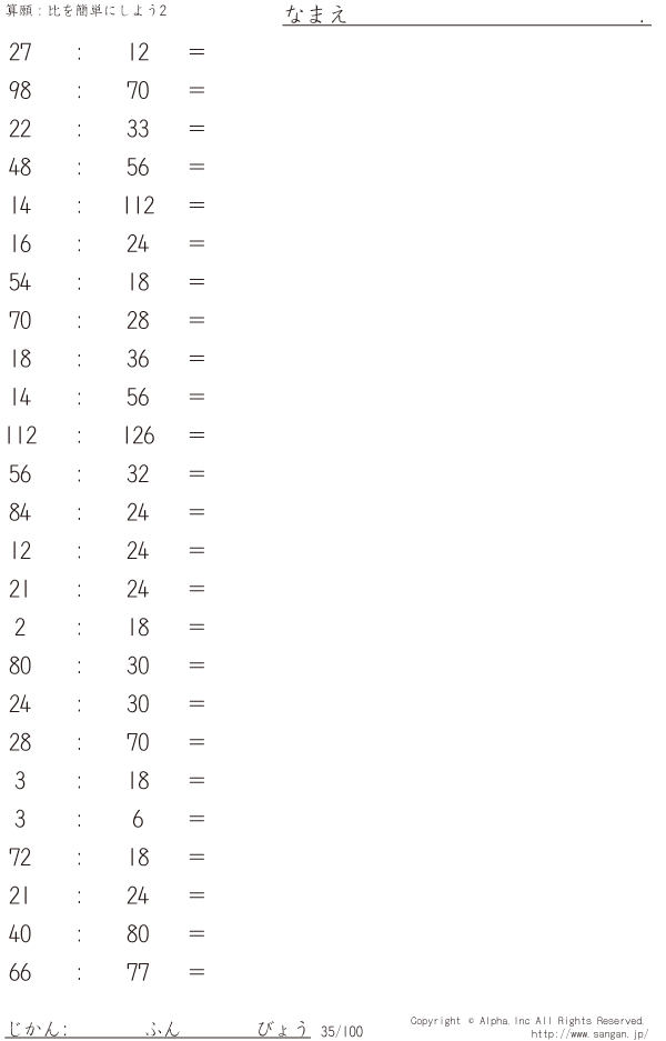 上記のボタンから「比を簡単にしよう2(難)」の算数数学ドリル・計算ドリル(PDFプリント)がダウンロードできます。個人利用は無料です(家庭以外での配布は有料です)。
