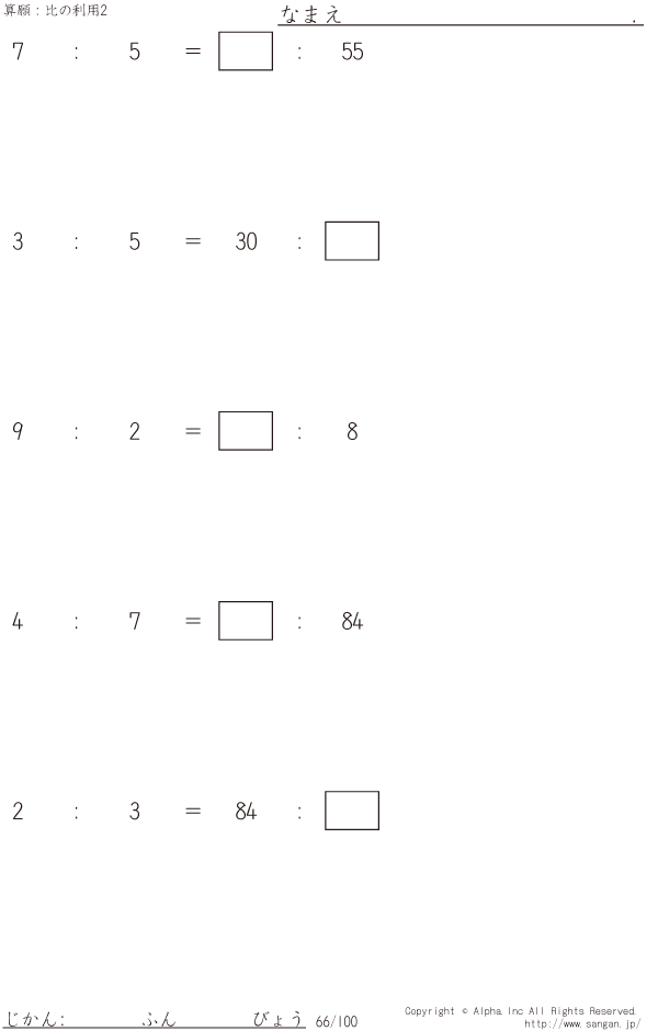 上記のボタンから「比の利用2(難)…比の穴埋め」の算数数学ドリル・計算ドリル(PDFプリント)がダウンロードできます。個人利用は無料です(家庭以外での配布は有料です)。