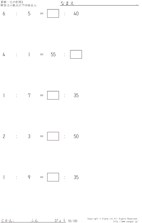 上記のボタンから「比の利用3(概数で答える)…比の穴埋め」の算数数学ドリル・計算ドリル(PDFプリント)がダウンロードできます。個人利用は無料です(家庭以外での配布は有料です)。