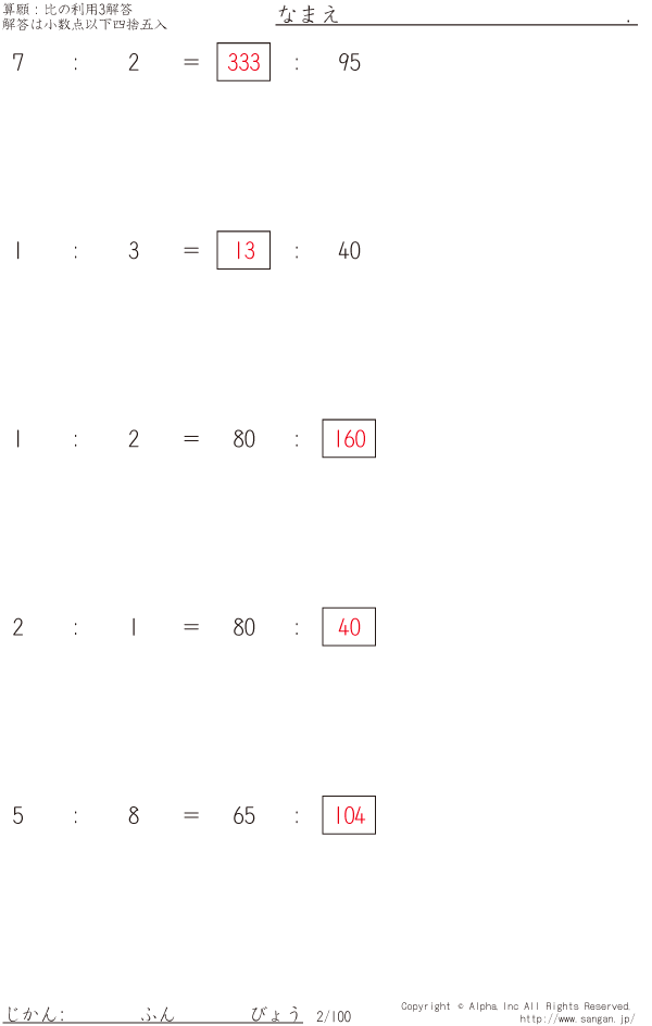 比の利用3(概数で答える)…比の穴埋め [解答]002/100