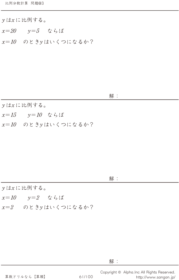 上記のボタンから「比例計算2(分数)」の算数数学ドリル・計算ドリル(PDFプリント)がダウンロードできます。個人利用は無料です(家庭以外での配布は有料です)。