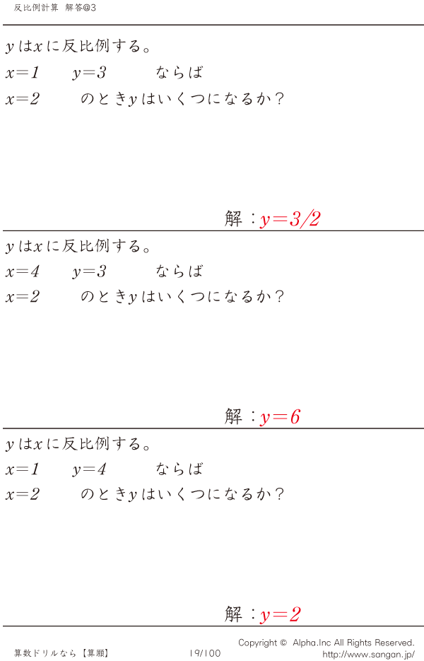 上記のボタンから「反比例計算」の算数数学ドリル・計算ドリル(PDFプリント)がダウンロードできます。個人利用は無料です(家庭以外での配布は有料です)。