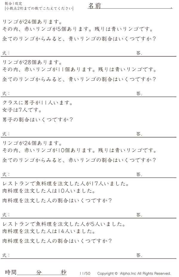上記のボタンから「割合1(小数で答える)」の算数数学ドリル・計算ドリル(PDFプリント)がダウンロードできます。個人利用は無料です(家庭以外での配布は有料です)。