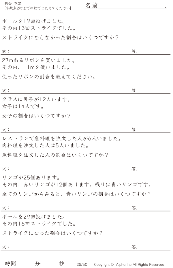 上記のボタンから「割合1(小数で答える)」の算数数学ドリル・計算ドリル(PDFプリント)がダウンロードできます。個人利用は無料です(家庭以外での配布は有料です)。