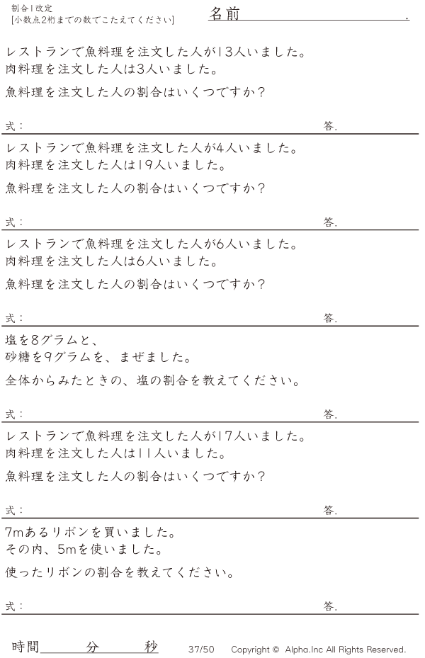 上記のボタンから「割合1(小数で答える)」の算数数学ドリル・計算ドリル(PDFプリント)がダウンロードできます。個人利用は無料です(家庭以外での配布は有料です)。