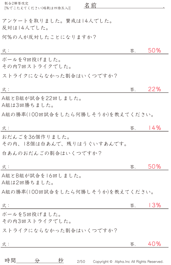 上記のボタンから「割合2(パーセントで答える)」の算数数学ドリル・計算ドリル(PDFプリント)がダウンロードできます。個人利用は無料です(家庭以外での配布は有料です)。