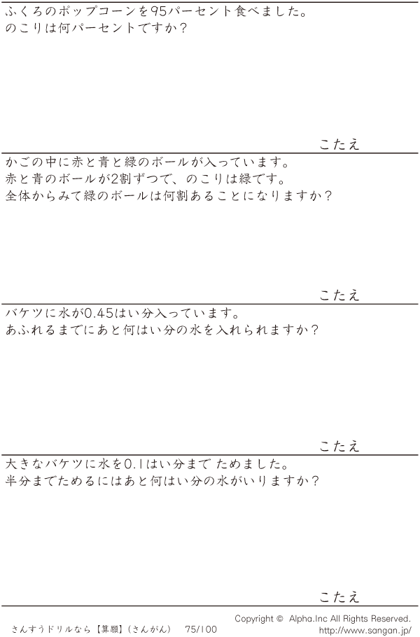 上記のボタンから「割合・百分率・歩合の基本」の算数数学ドリル・計算ドリル(PDFプリント)がダウンロードできます。個人利用は無料です(家庭以外での配布は有料です)。