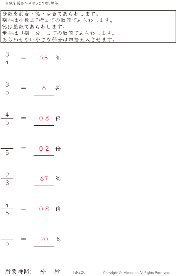 分数を割合へ 分母5まで@7 [解答]018/200