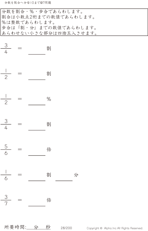 分数を割合へ 分母10まで@7の問題解答ガイド