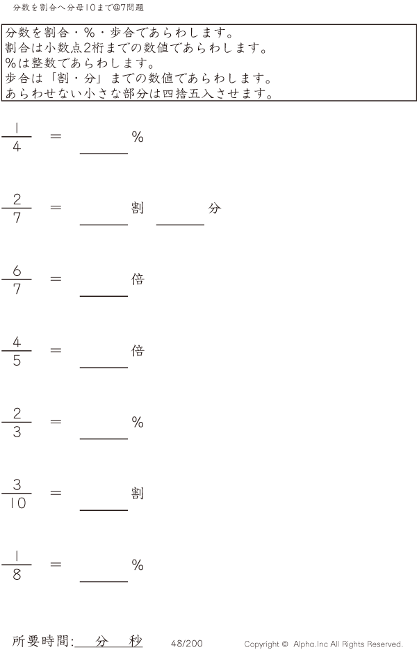 上記のボタンから「分数を割合へ 分母10まで@7」の算数数学ドリル・計算ドリル(PDFプリント)がダウンロードできます。個人利用は無料です(家庭以外での配布は有料です)。