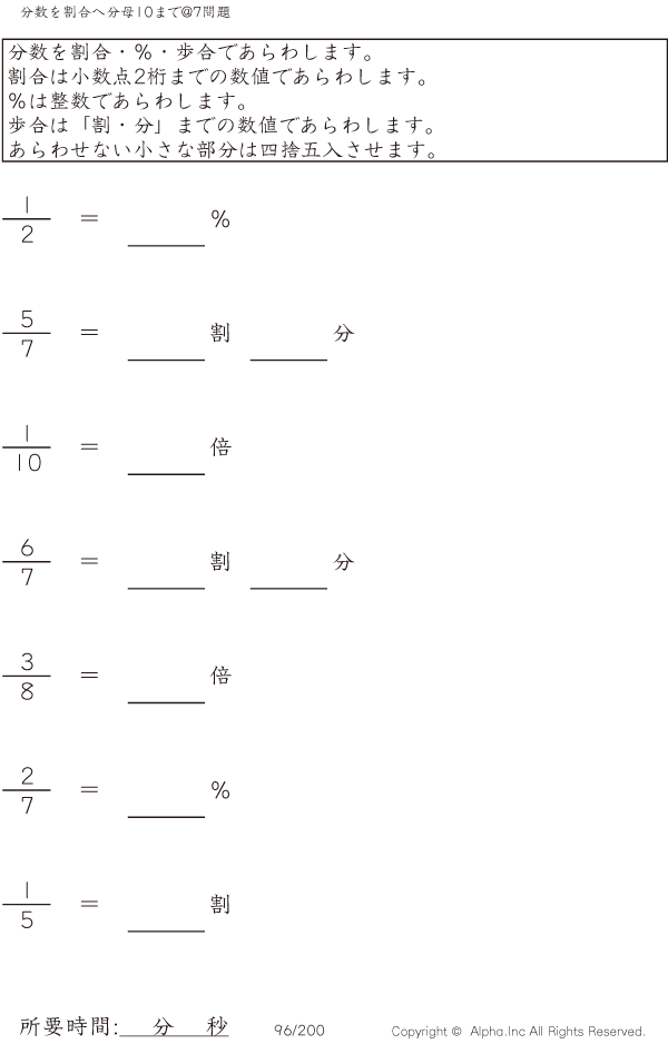 分数を割合へ 分母10まで@7 [問題]096/200