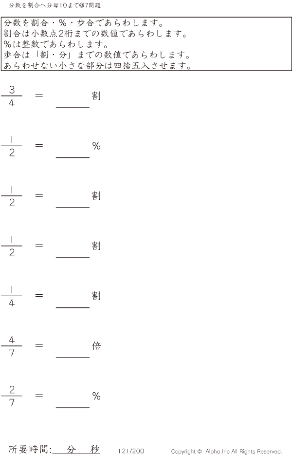 分数を割合へ 分母10まで@7の問題解答ガイド
