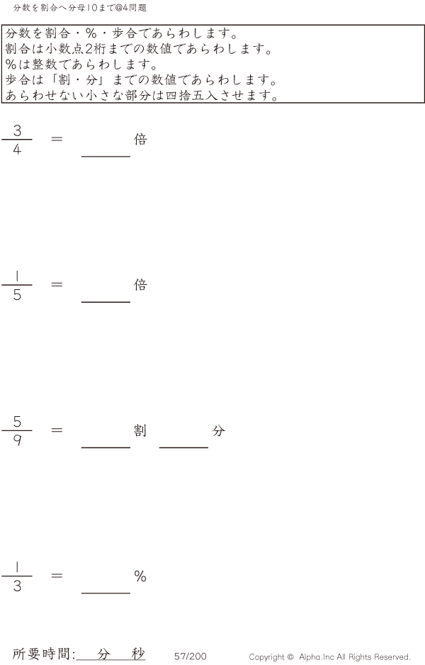 分数を割合へ 分母10まで@4の問題解答ガイド
