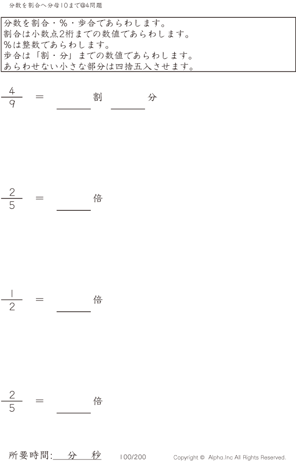 分数を割合へ 分母10まで@4の問題解答ガイド