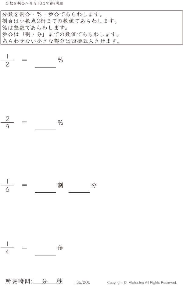 分数を割合へ 分母10まで@4 [問題]136/200