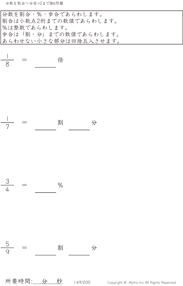 分数を割合へ 分母10まで@4の問題解答ガイド