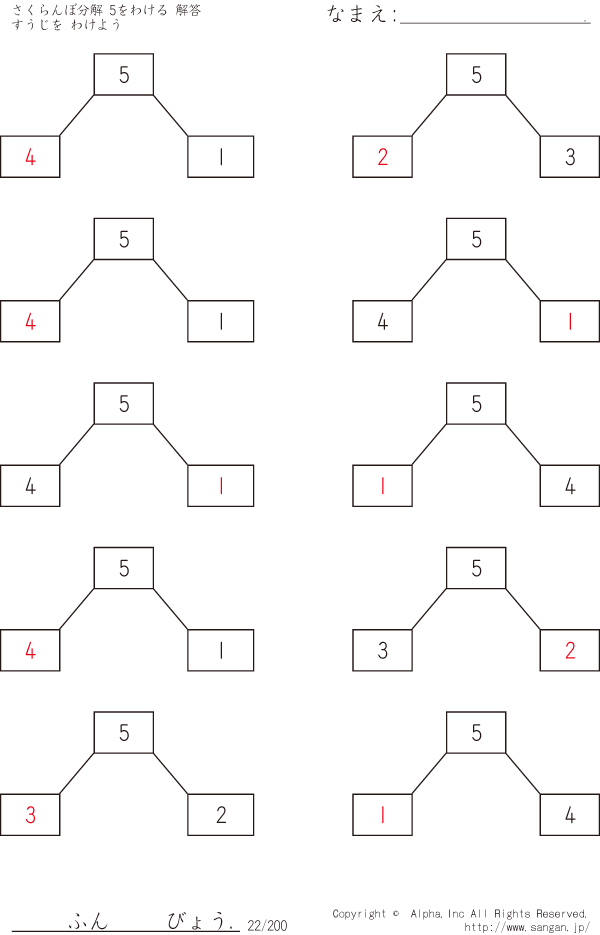 さくらんぼ分解 すうじをわけよう 5をわける [解答]022/200