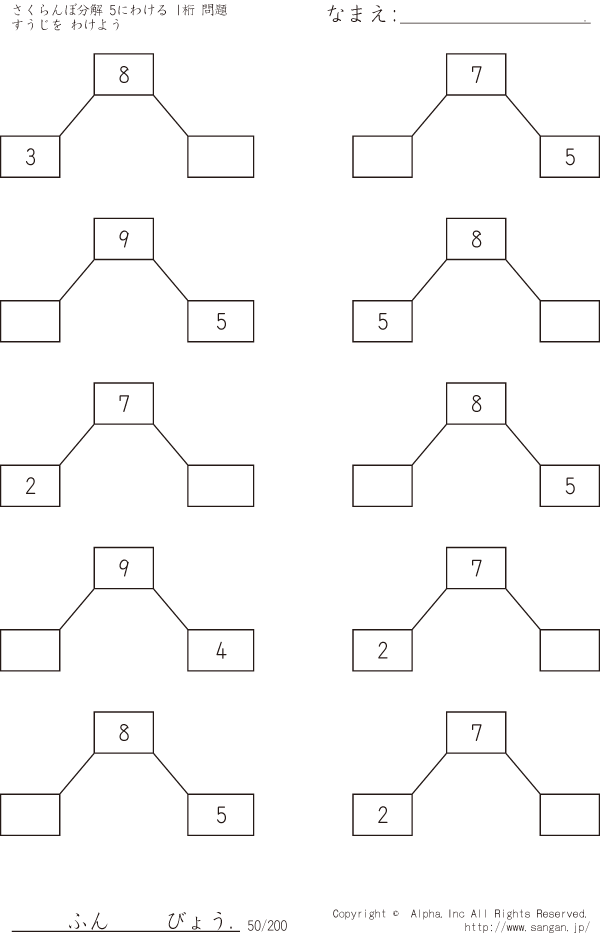 さくらんぼ分解 すうじをわけよう 5にわける 1桁 [問題]050/200