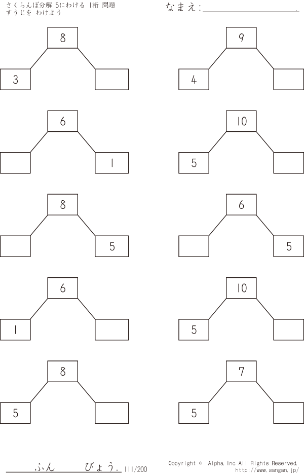 さくらんぼ分解 すうじをわけよう 5にわける 1桁 [問題]111/200