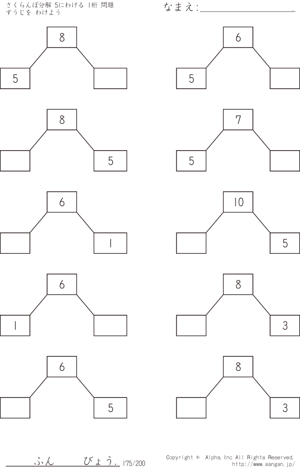 さくらんぼ分解 すうじをわけよう 5にわける 1桁 [問題]175/200