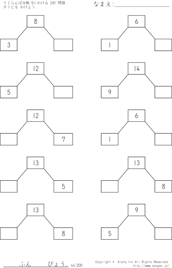 さくらんぼ分解 すうじをわけよう 5にわける 2桁 [問題]044/200
