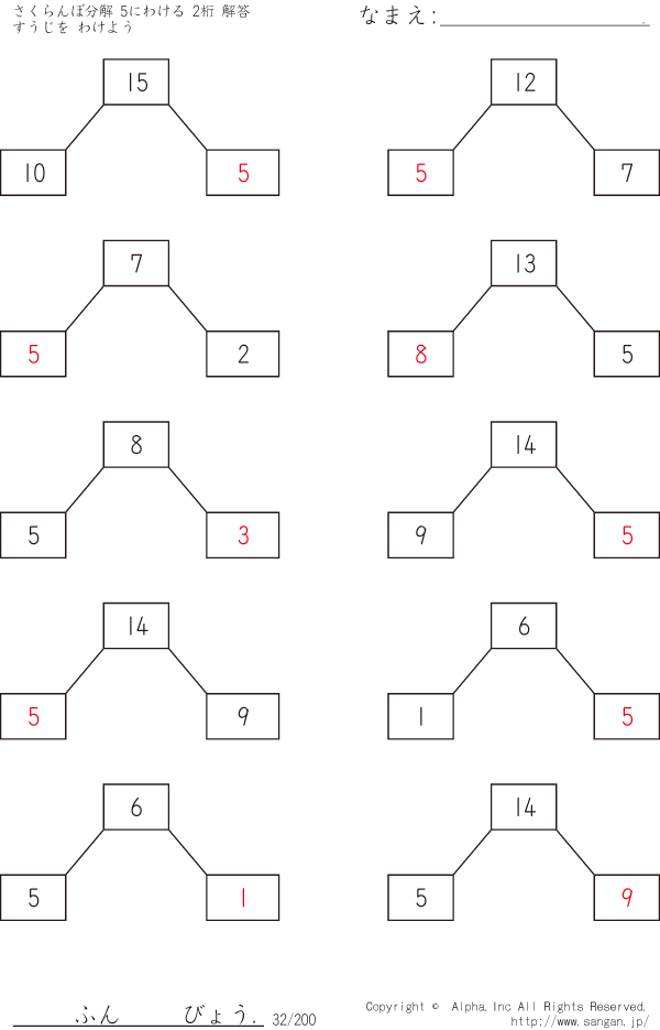 さくらんぼ分解 すうじをわけよう 5にわける 2桁 [解答]032/200