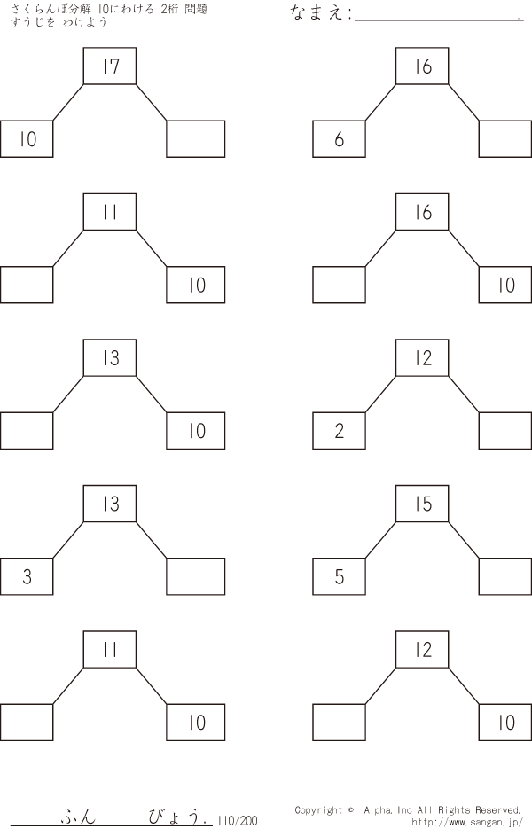 さくらんぼ分解 すうじをわけよう 10にわける 2桁 [問題]110/200