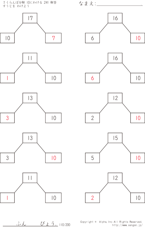さくらんぼ分解 すうじをわけよう 10にわける 2桁 [解答]110/200
