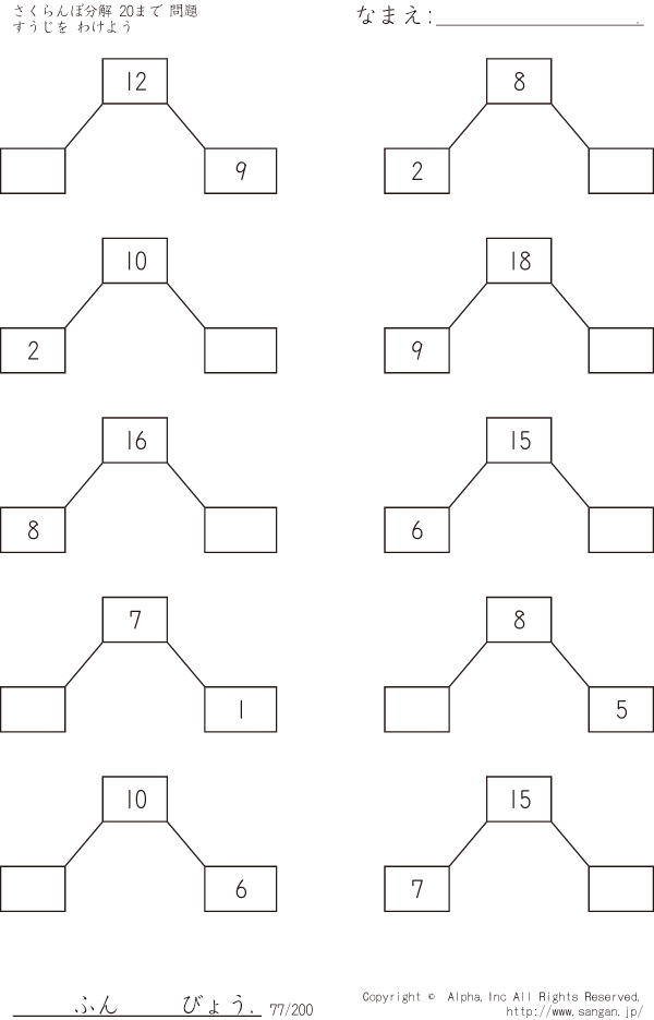 さくらんぼ分解 すうじをわけよう 20まで [問題]077/200