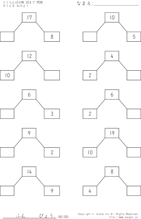 さくらんぼ分解 すうじをわけよう 20まで [問題]180/200