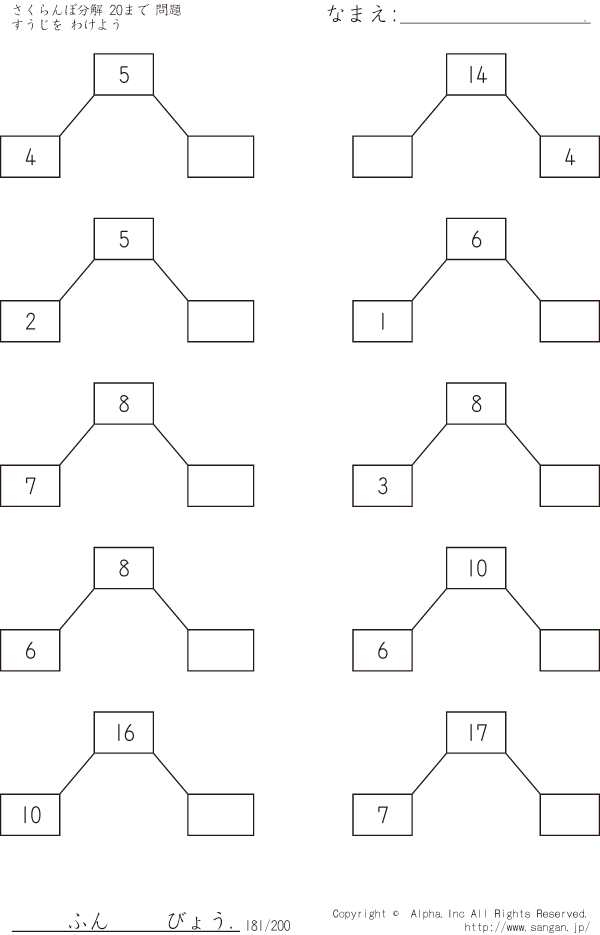 さくらんぼ分解 すうじをわけよう 20まで [問題]181/200