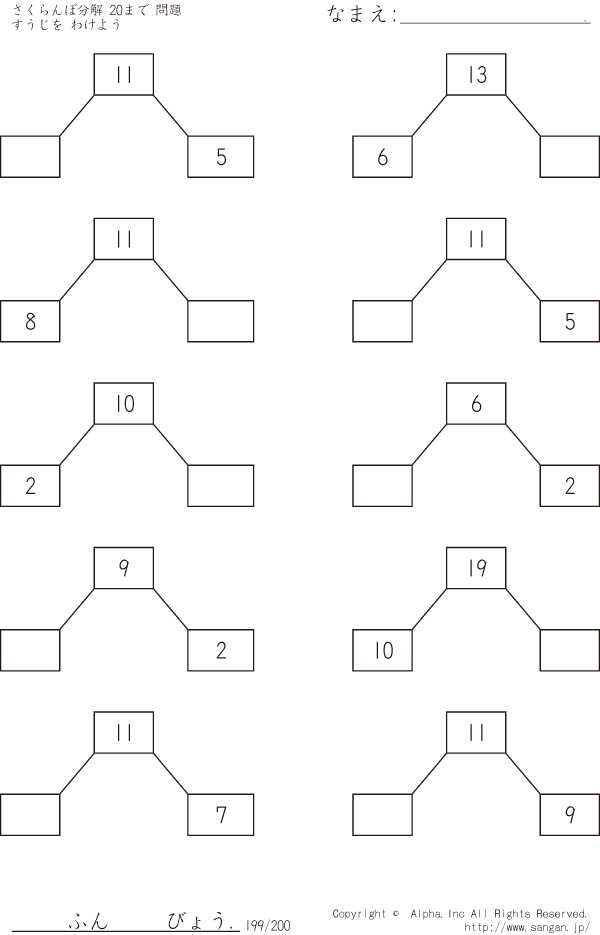 さくらんぼ分解 すうじをわけよう 20まで [問題]199/200