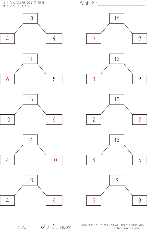 さくらんぼ分解 すうじをわけよう 20まで [解答]198/200
