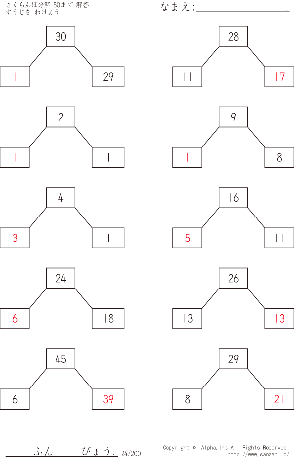 さくらんぼ分解 すうじをわけよう 50まで [解答]024/200