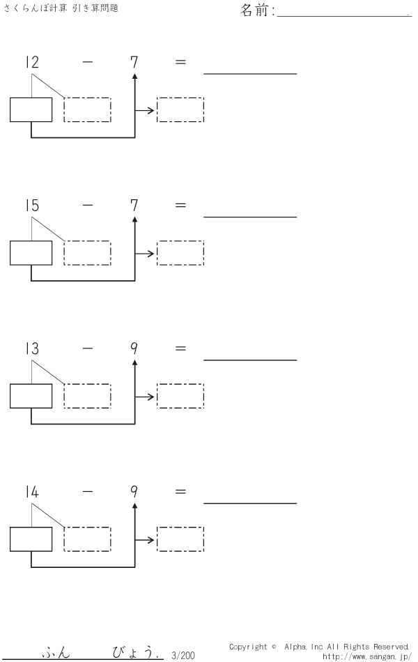 上記のボタンから「さくらんぼ計算 引き算」の算数数学ドリル・計算ドリル(PDFプリント)がダウンロードできます。個人利用は無料です(家庭以外での配布は有料です)。