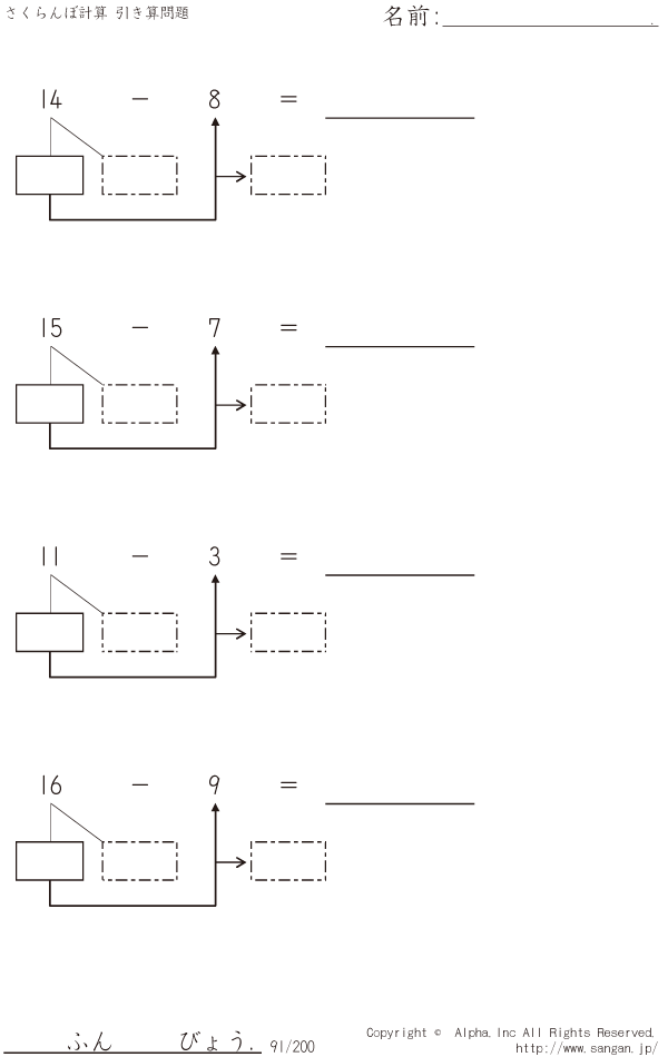 上記のボタンから「さくらんぼ計算 引き算」の算数数学ドリル・計算ドリル(PDFプリント)がダウンロードできます。個人利用は無料です(家庭以外での配布は有料です)。