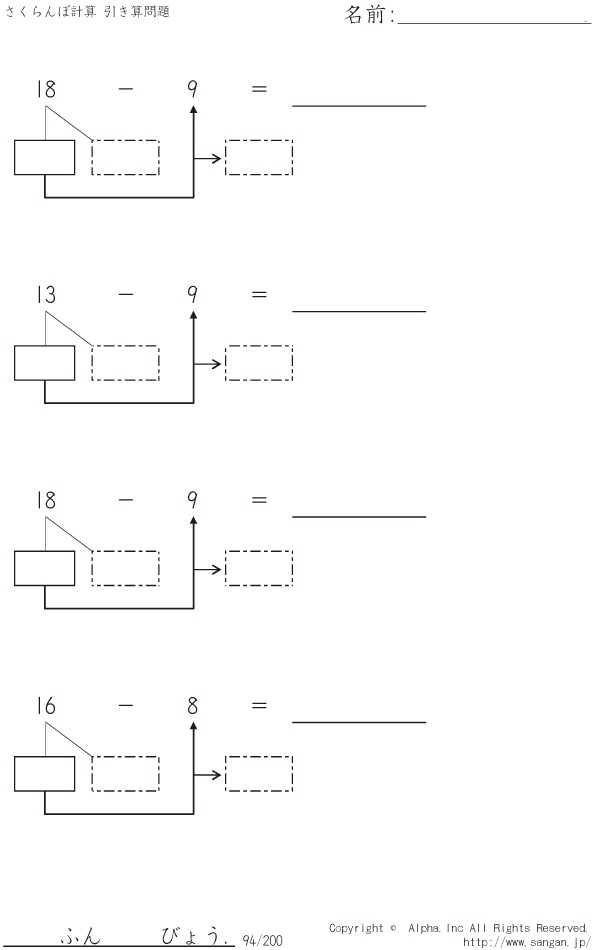 上記のボタンから「さくらんぼ計算 引き算」の算数数学ドリル・計算ドリル(PDFプリント)がダウンロードできます。個人利用は無料です(家庭以外での配布は有料です)。