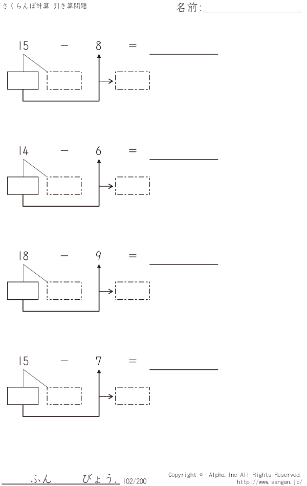 上記のボタンから「さくらんぼ計算 引き算」の算数数学ドリル・計算ドリル(PDFプリント)がダウンロードできます。個人利用は無料です(家庭以外での配布は有料です)。