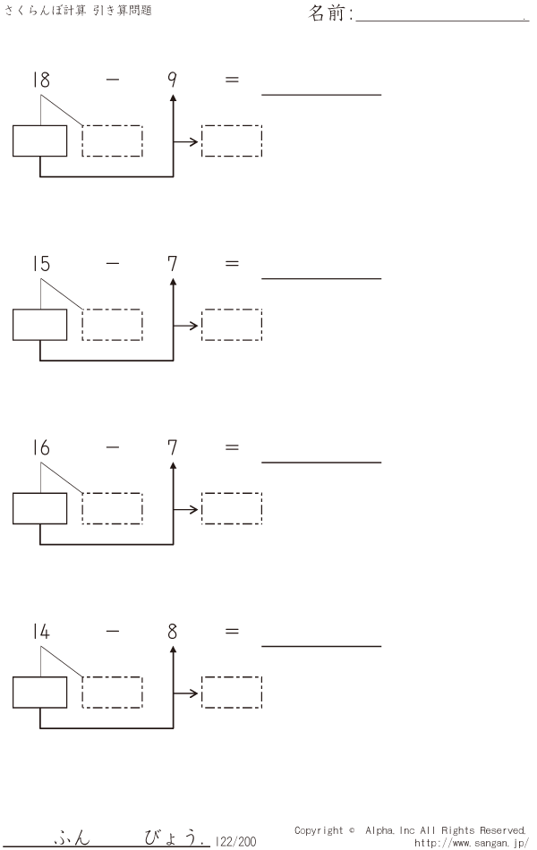 上記のボタンから「さくらんぼ計算 引き算」の算数数学ドリル・計算ドリル(PDFプリント)がダウンロードできます。個人利用は無料です(家庭以外での配布は有料です)。