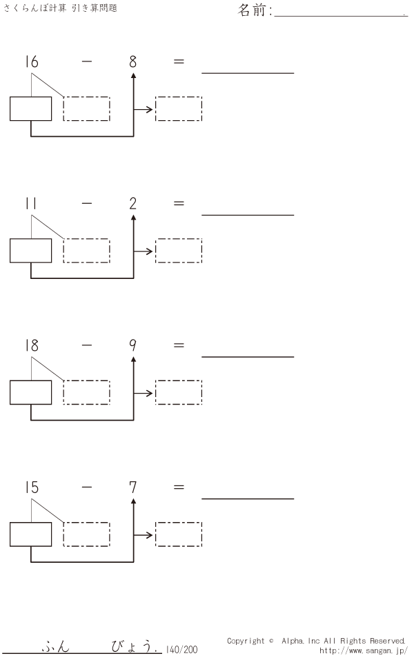 上記のボタンから「さくらんぼ計算 引き算」の算数数学ドリル・計算ドリル(PDFプリント)がダウンロードできます。個人利用は無料です(家庭以外での配布は有料です)。
