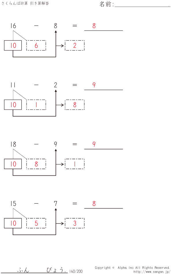 上記のボタンから「さくらんぼ計算 引き算」の算数数学ドリル・計算ドリル(PDFプリント)がダウンロードできます。個人利用は無料です(家庭以外での配布は有料です)。