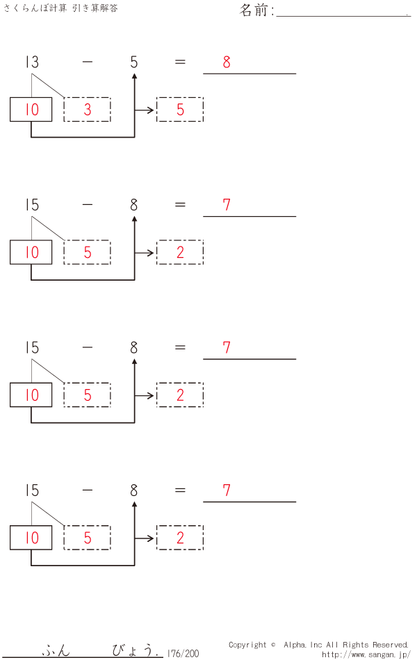 上記のボタンから「さくらんぼ計算 引き算」の算数数学ドリル・計算ドリル(PDFプリント)がダウンロードできます。個人利用は無料です(家庭以外での配布は有料です)。