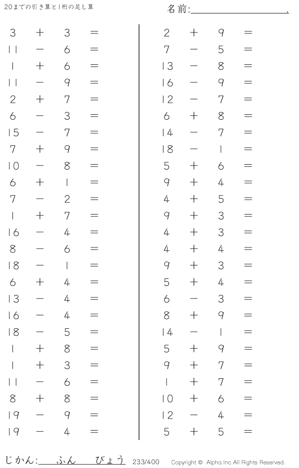 上記のボタンから「19までの引き算と1ケタの足し算」の算数数学ドリル・計算ドリル(PDFプリント)がダウンロードできます。個人利用は無料です(家庭以外での配布は有料です)。