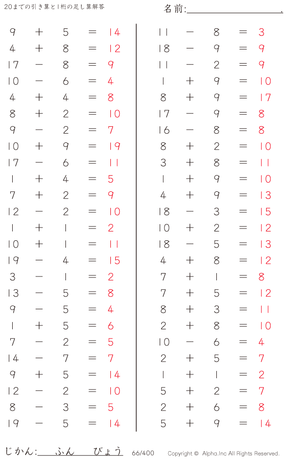 19までの引き算と1ケタの足し算の問題解答ガイド