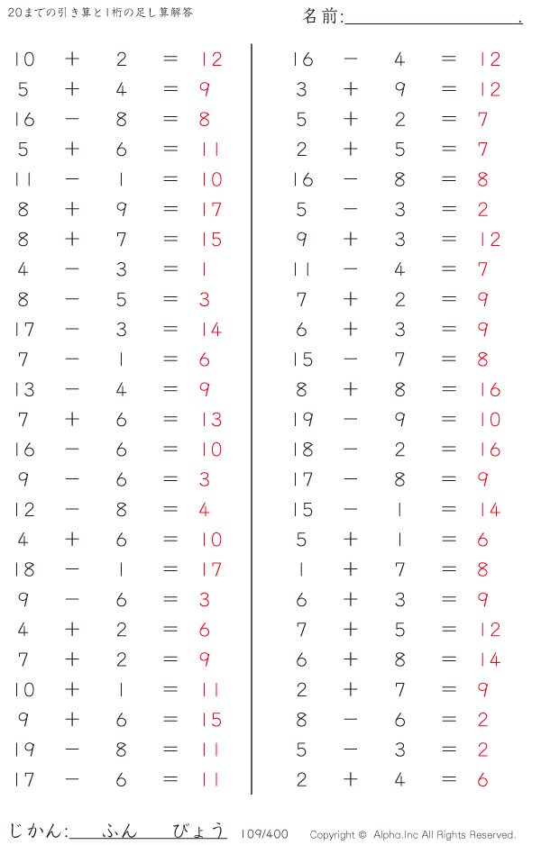 19までの引き算と1ケタの足し算の問題解答ガイド