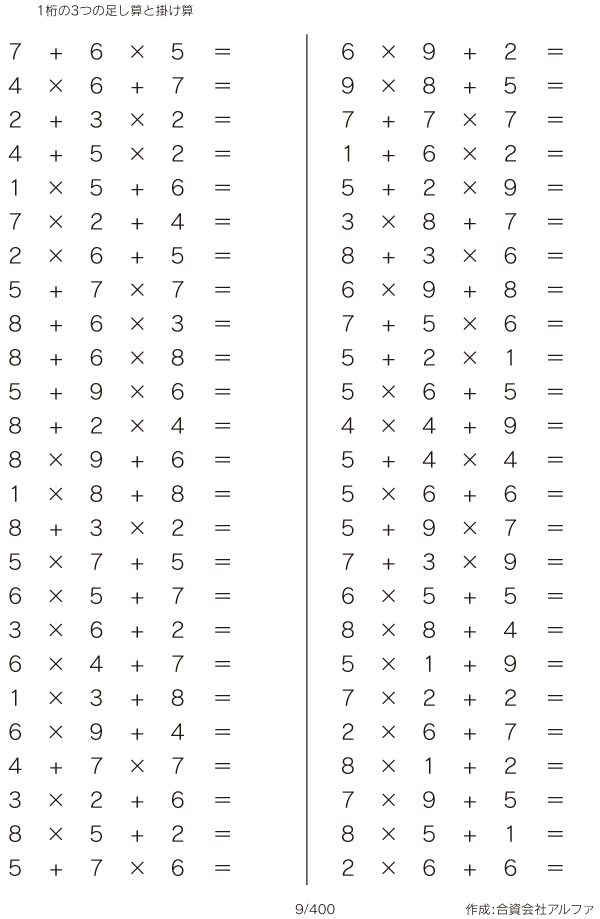 上記のボタンから「1桁の3つの足し算と掛け算」の算数数学ドリル・計算ドリル(PDFプリント)がダウンロードできます。個人利用は無料です(家庭以外での配布は有料です)。