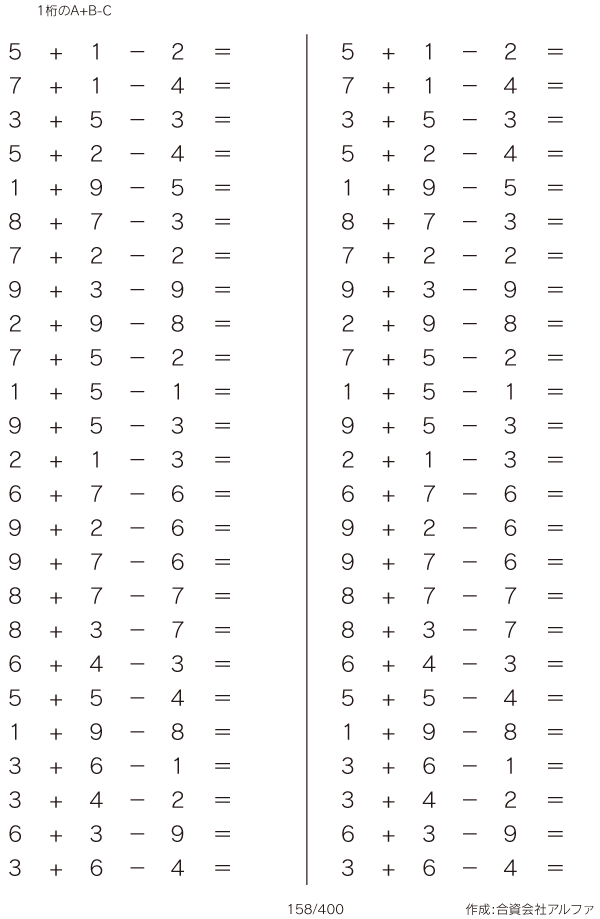 上記のボタンから「1桁のA+B-C」の算数数学ドリル・計算ドリル(PDFプリント)がダウンロードできます。個人利用は無料です(家庭以外での配布は有料です)。