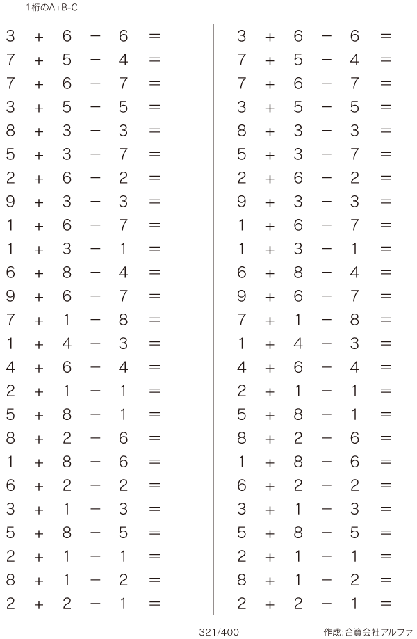 上記のボタンから「1桁のA+B-C」の算数数学ドリル・計算ドリル(PDFプリント)がダウンロードできます。個人利用は無料です(家庭以外での配布は有料です)。