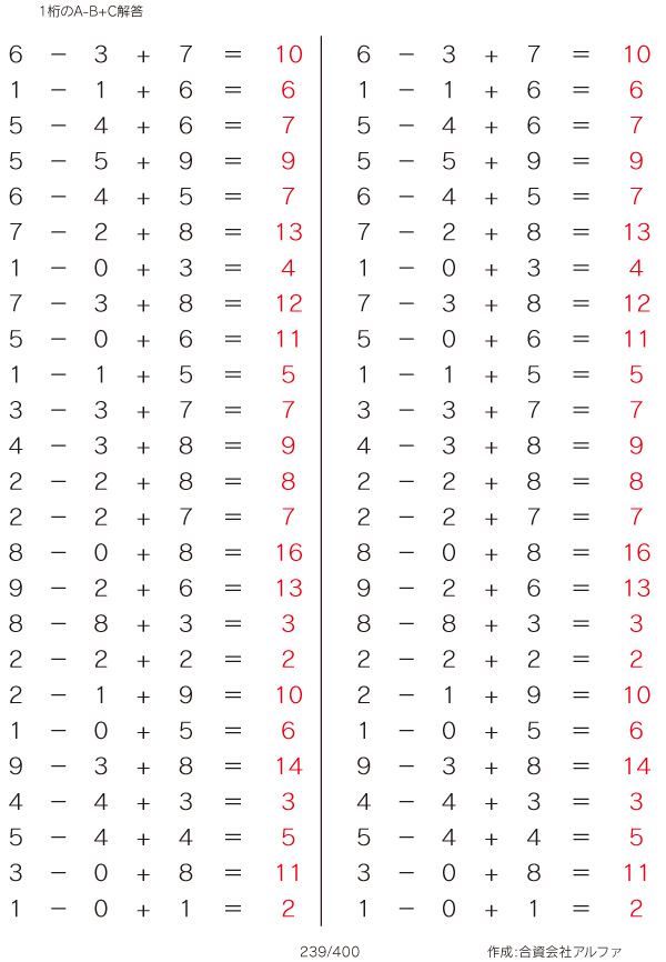 上記のボタンから「1桁のA-B+C」の算数数学ドリル・計算ドリル(PDFプリント)がダウンロードできます。個人利用は無料です(家庭以外での配布は有料です)。