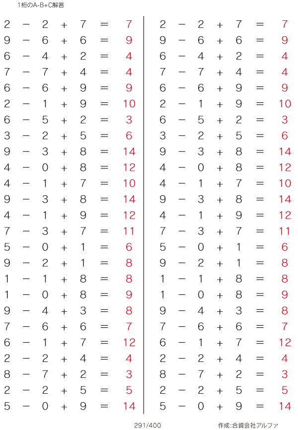 上記のボタンから「1桁のA-B+C」の算数数学ドリル・計算ドリル(PDFプリント)がダウンロードできます。個人利用は無料です(家庭以外での配布は有料です)。